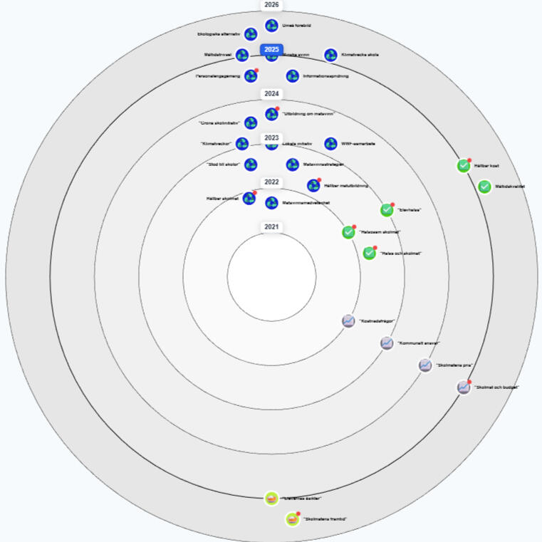 +Alla identifierade initiativ placeras visuellt på en radarbild.+På radarbilden kan du se när i tiden varje initiativ är aktuellt eller relevant.+Under bilden finns en lista med initiativen som alternativ översikt.