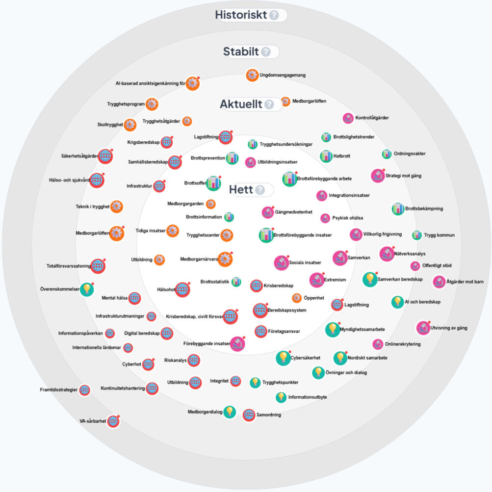 +Alla identifierade initiativ placeras visuellt på en radarbild.+På radarbilden kan du se när i tiden varje initiativ är aktuellt eller relevant.+Under bilden finns en lista med initiativen som alternativ översikt.